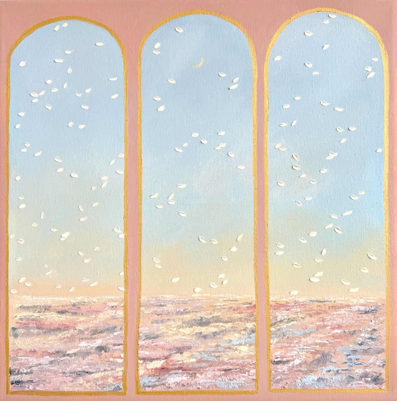 За арочными окнами раскинулась живописная природа: цветущие поля, которые символизируют жизненные возможности и красоту окружающего мира. На переднем плане раскачиваются цветы, которые, как и мысли человека, стремятся к свету, подчеркивая важность внутренней поддержки и самопринятия.