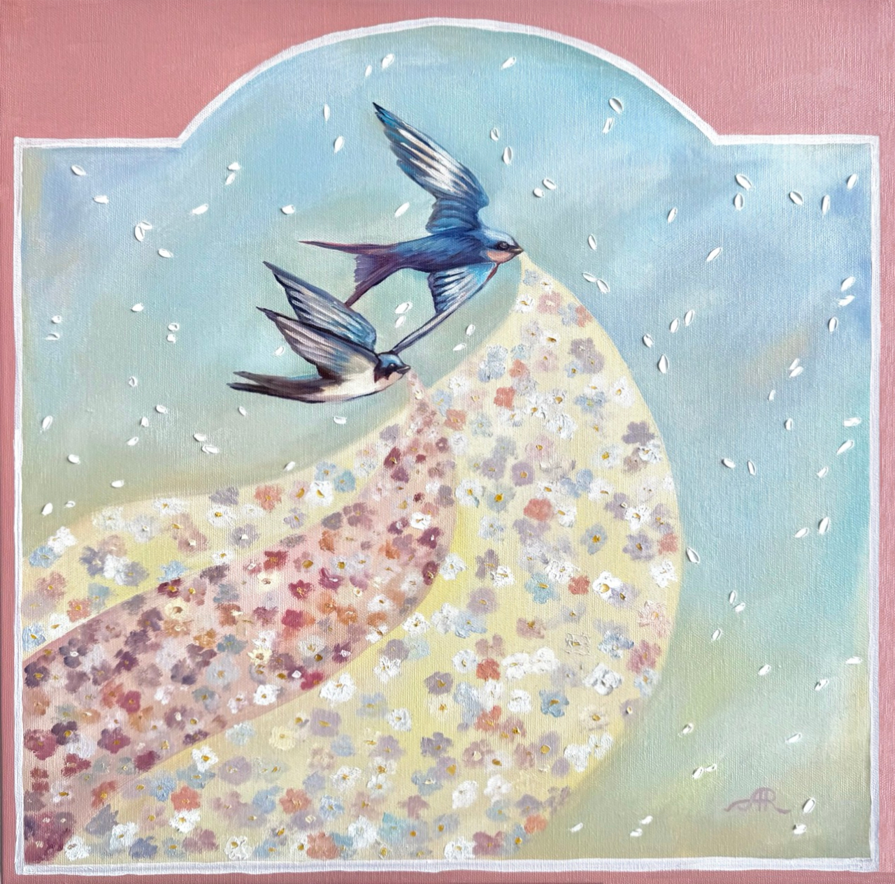 Вся композиция наполнена светом и теплом, создавая атмосферу надежды и вдохновения. Эта картина передает ощущение весеннего пробуждения, когда природа и душа человека начинают новый цикл жизни, полны энергии и стремления к свободе. Неслучайно на картине появляются ласточки. Ласточка - перелетная птица, символ свободы, бегства от ограничений. Она ассоциируется с приходом весны, несет на своих крыльях свежий поток идей и обновления. Ласточка - близкая к человеку птица. Она “домовитая”, потому что вьет гнезда под крышей человеческого жилья, она живет с людьми, но принадлежит небесам, потому что, в отличие от голубя или воробья, не умеет передвигаться по земле. Ласточки - образ заботы и крепкой семьи, поскольку считается, что они образуют пары на всю жизнь. Поэтому картина хороша для поддержания в доме теплой семейной атмосферы и для тех кто хочет создать союз вокруг семейного очага.